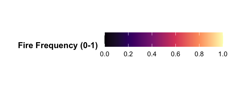 | Fire frequency | Fire occurrence (monthly) | Measures if the cell was burned or not (binary, 0 or 1). When averaged across years, represents the proportion of years a pixel burned in each month (Jan-Dec). |